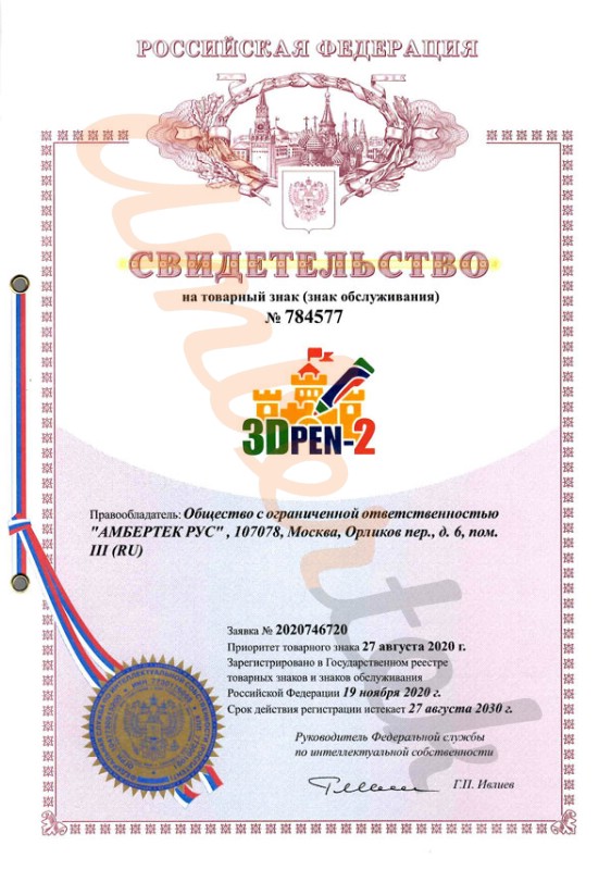 На основании Свидетельства №784577 "3DPEN-2" является зарегистрированным товарным знаком компании ООО "Амбертек РУС" (ОГРН 1147746344151). Вся продукция сертифицирована – Декларация о соответствии ЕАЭС N RU Д-CN.РА01.В.60250/21 от 30 января 2021 года.